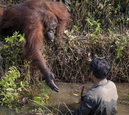 Uma imagem captada por um fotógrafo amador em uma área de conservação na ilha de Bornéu, no sudeste asiático, mostrou um momento inusitado da relação humano - animal: um orangotango foi flagrado oferecendo ajuda para um homem que estava em um rio com cobras. As informações são do IG.