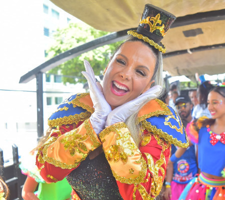 No look, a artista escolheu um sobretudo bastante colorido, um body com brilhos, luvas brancas e uma cartola preta com detalhes dourados. O bloco Algodão Doce comemora os 20 anos de folia este ano.