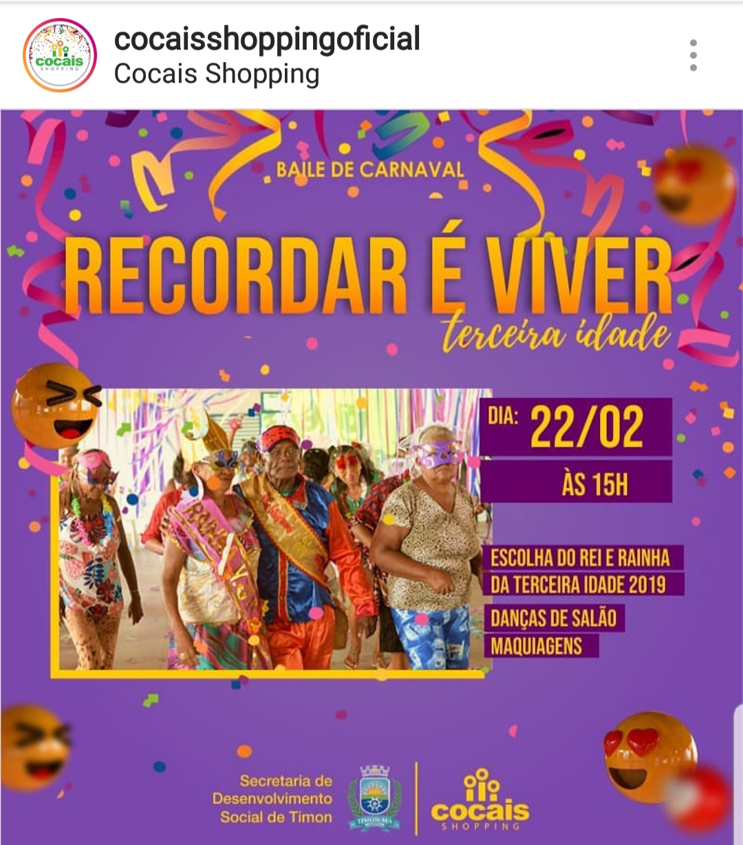 Acontece nesta sexta-feira (22) o baile de carnaval "Recordar é Viver", voltado para a terceira idade. Promovido pelo Cocais Shopping, o evento busca promover a autoestima de idosos e escolher a Rainha e o Rei do Carnaval da Terceira Idade 2019. Além de muito samba no pé, o espaço será tomado por dança de salão e maquiagens.