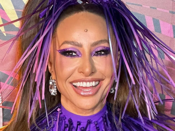 Após brilhar no tradicional Baile de Carnaval do Copacabana Palace com um vestido cor-de-rosa, a apresentadora resolveu apostar num look lilás bem chamativo.