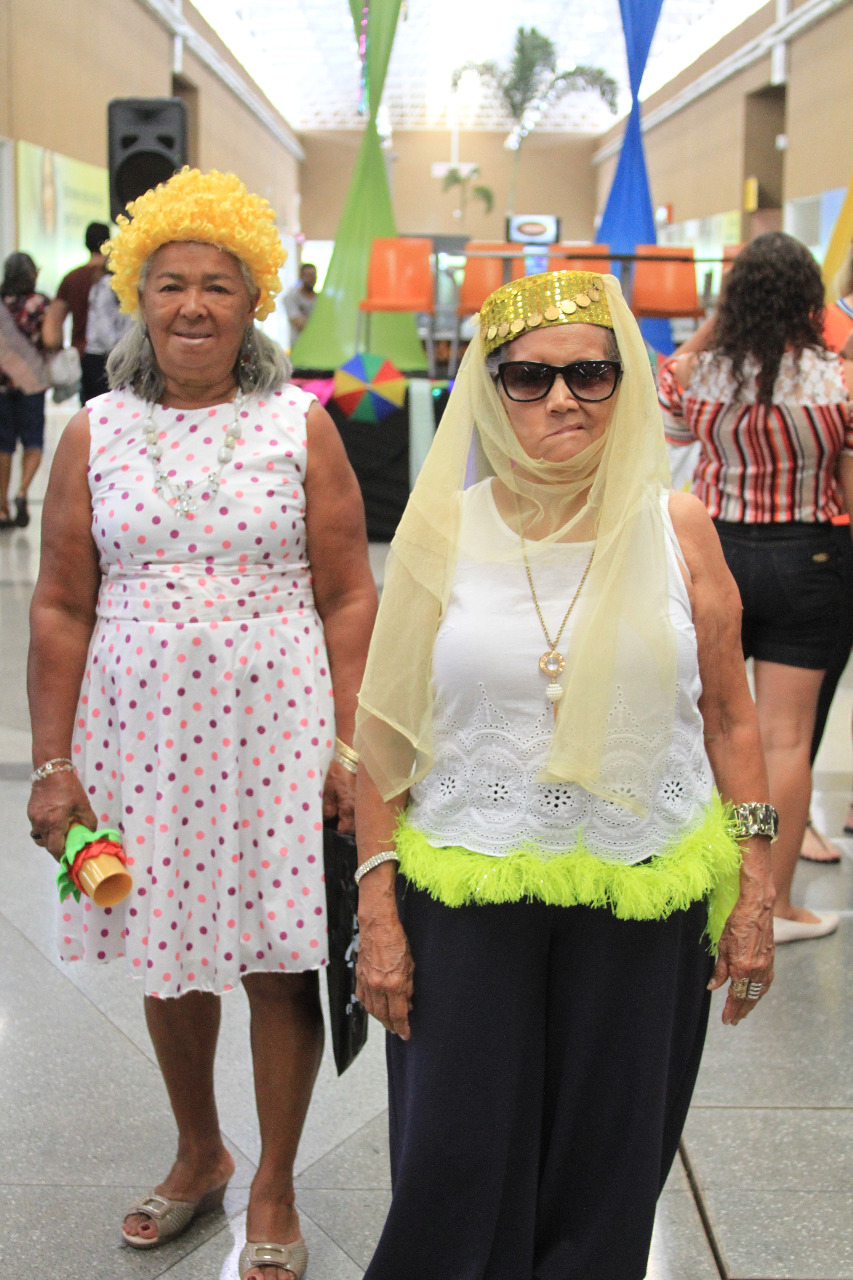 Maria da Conceição e Maria do Socorro. Crédito: Raíssa Morais. Maria da Conceição, de 73, apostou em um look das arábias. “Sempre gostei de carnaval, toda brincadeira eu gosto. Gosto de sambar, de dançar, de ser feliz. Vamos pular o carnaval”, convida a senhora.