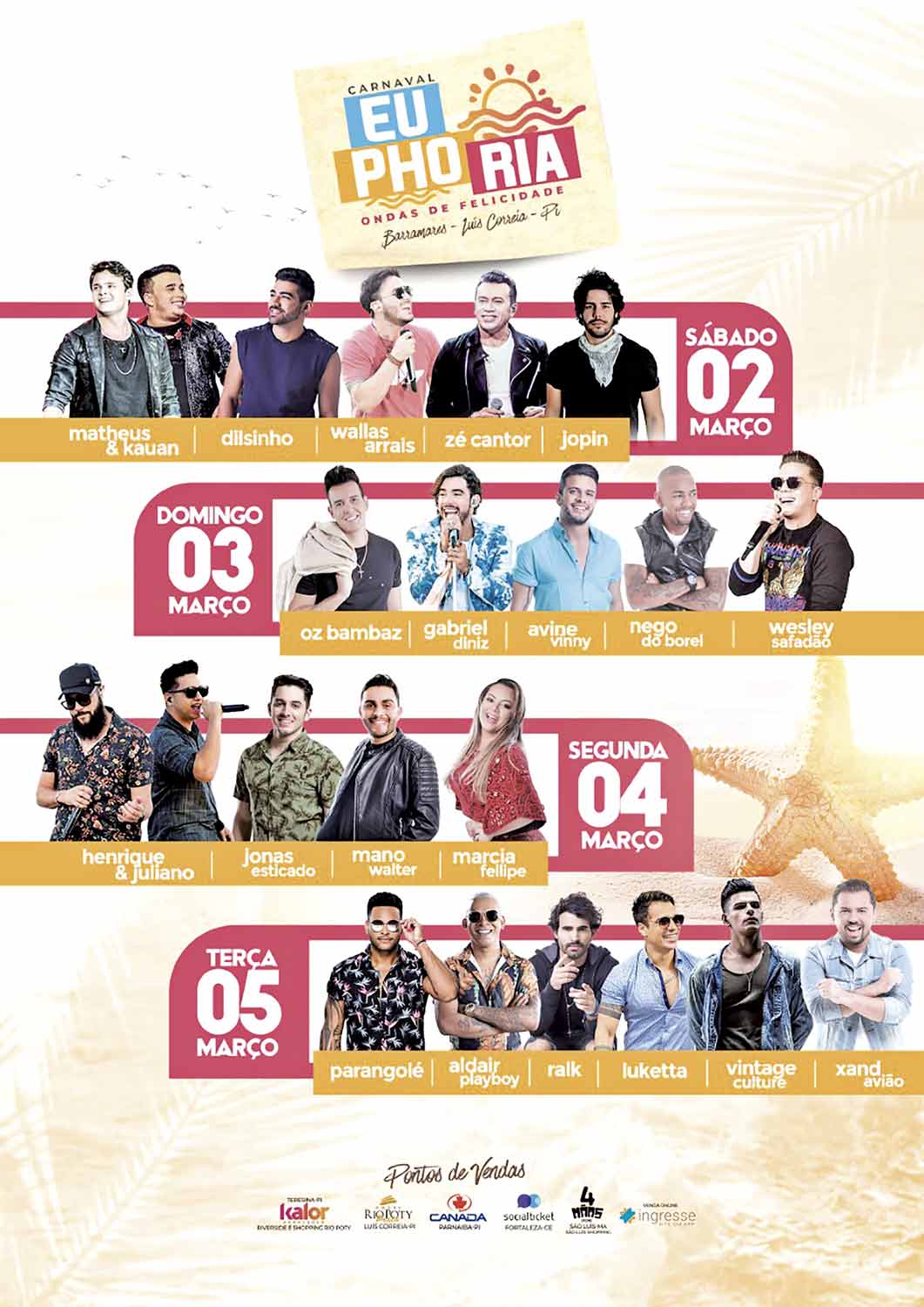 O Carnaval Euphoria já está no segundo lote de vendas. Corra e garanta seu passaporte para o maior Carnaval do litoral do Brasil. Em Teresina, os pontos de venda estão instalados nas lojas da Kalor Produções (Riverside e Shopping Rio Poty) e na Noroeste da Praça Saraiva; em Timon, as vendas acontecem na Noroeste do Cocais Shopping; em Parnaíba, na Canadá Veículos; em Luís Correia, no Rio Poty Hotel Praia, e em Picos, na Salvatore Barbershop, do Picos Plaza Shopping. Tem ponto de venda também em Fortaleza, na Social Ticket do Rio Mar Shopping Fortaleza; e em São Luís, na 4 Mãos Stores do São Luís Shopping. As vendas de passaportes on-line acontecem no site ou aplicativo Ingresse.