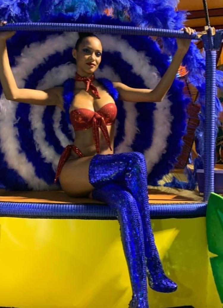 Para algumas das fantasias, ele apostou nas duas cores, como no costão de Laís Ribeiro e no vestido longo e justo de Camila Coutinho. Carol Trentini veste um body nude com plumas e modelagem nos seios que lembra o sutiã cônico, desenhado por Gaultier para Madonna nos anos 1990.