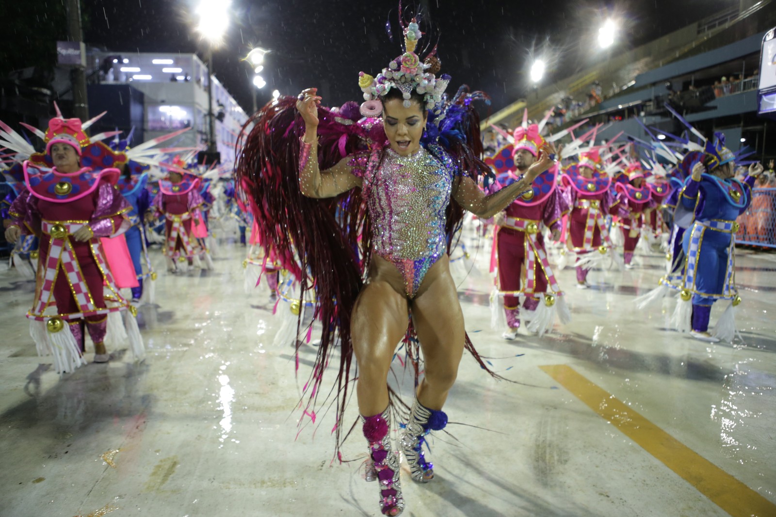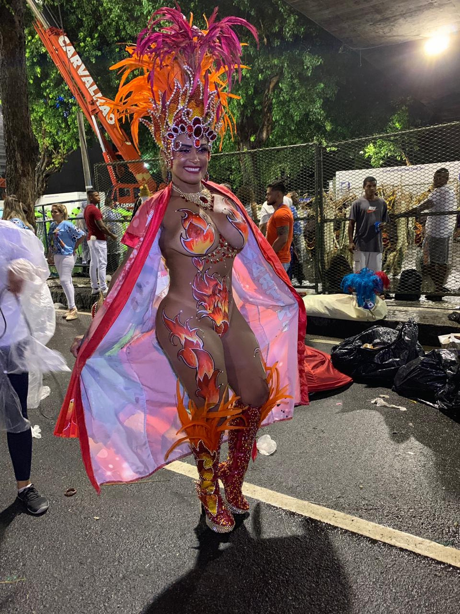 “Ih, choveu... meu body encolheu”, brincou Michelly Boechat, musa da Unidos da Ponte, sobre o figurino mínimo com que cruzou a Marquês de Sapucaí.
