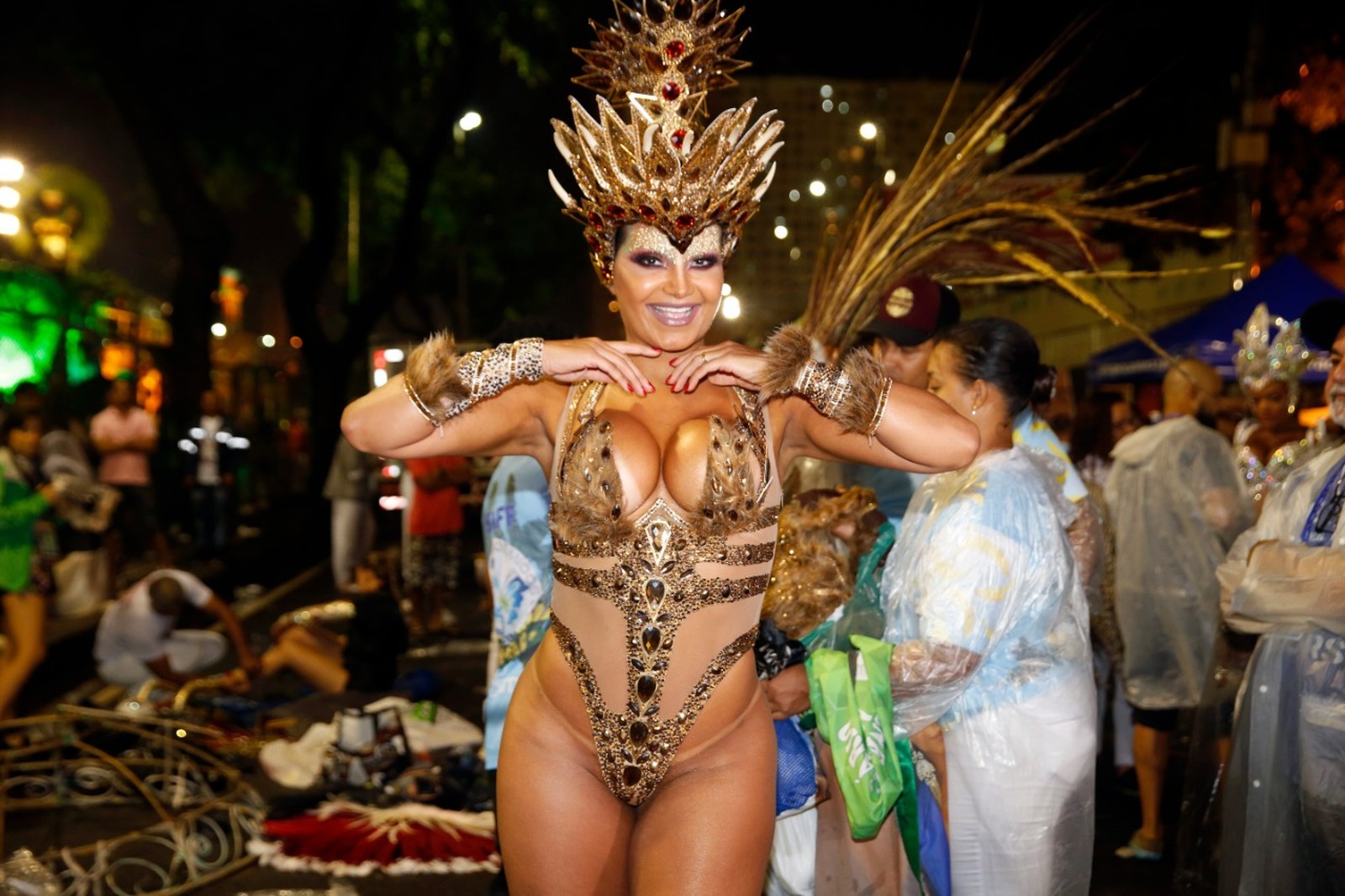 Shayenne Cesário, musa da Acadêmicos da Rocinha, foi ainda mais espirituosa. “O tapa-sexo está bem pequenininho. Cabe só a preciosidade lá, mais nada”, riu. “A fantasia é bem pequenininha, era o tchan. O costeiro, que é bastante pesado, vai acompanhando o figurino”, detalhou. Outra que “poupou tecido” foi Monika Nascimento, rainha da Rocinha. O costeiro colorido contrastava com a miudeza do maiô.