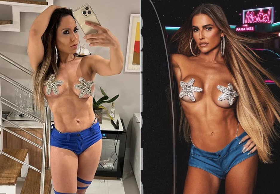 A modelo usou um look com adesivos nos seios em formato de estrelas prateadas e shortinho jeans, bem parecido com o look usado por Deborah Secco recentemente para ir ao Baile da Vogue, onde ela reviveu a personagem do filme homônimo estrelado por ela em 2011.