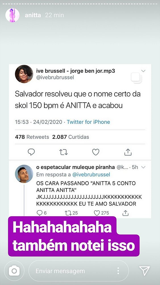 Ao fim de cada Carnaval de Salvador, a virose que vem como efeito colateral da festa é batizada com o nome do hit da folia. Valendo-se deste "know-how", os foliões resolveram levar a arte da renomeação para outros campos e transformaram a Skol Beats 150bpm em "bebida da Anitta". Informações do I bahia.