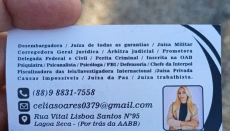 As investigações apontam que, em Juazeiro do Norte, Célia se apresentava com diversos títulos incompatíveis, incluindo desembargadora, promotora, advogada, juíza militar, agente do FBI, chefe da Interpol e até “guardiã da democracia mundial”.
