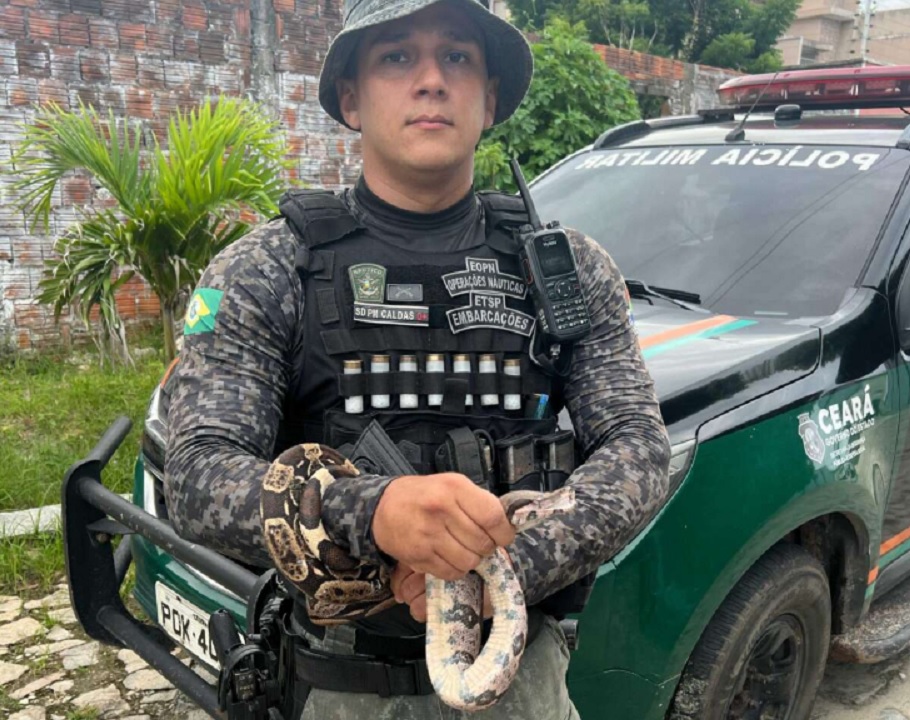 A Polícia Militar do Ceará (PMCE) resgatou cobra jiboia na terça (1º). A espécie pertencente à família boa constrictor, serpente de médio porte, pode atingir até quatro metros de comprimento, mas não tem peçonha. O animal estava em um terreno no bairro Sapiranga – Área de Integrada de Segurança 7 (AIS 7) da Capital.
