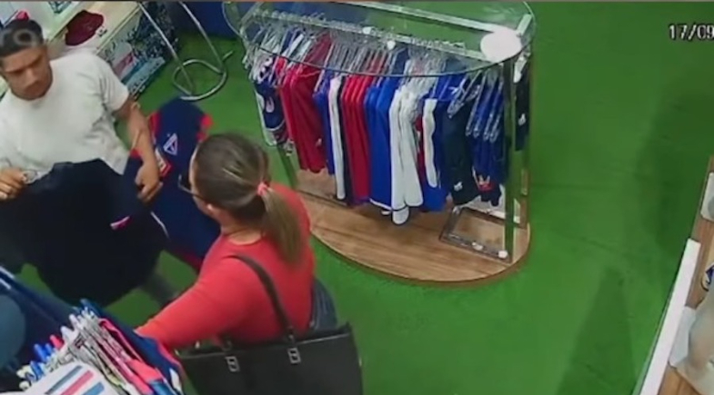 Um casal furtou camisas oficiais do Fortaleza em uma loja localizada no térreo de um shopping no bairro Aldeota, área nobre da capital cearense. A ação, registrada por câmeras de segurança, ocorreu de forma premeditada e contou com a participação de uma terceira pessoa, responsável por distrair a vendedora do estabelecimento.