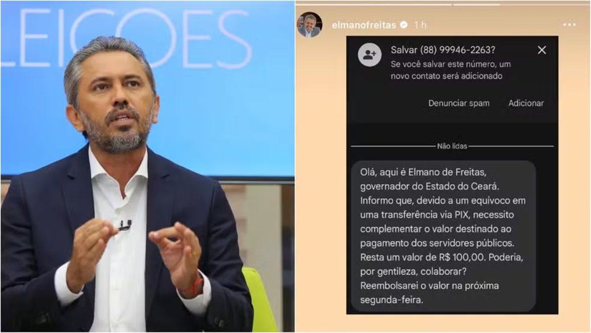 "Olá, aqui é Elmano de Freitas, governador do Estado do Ceará. Informo que, devido a um equívoco em uma transferência via PIX, necessito complementar o valor destinado ao pagamento dos servidores públicos. Resta um valor de R$ 100,00. Poderia, por gentileza, colaborar? Reembolsarei o valor na próxima segunda-feira."
