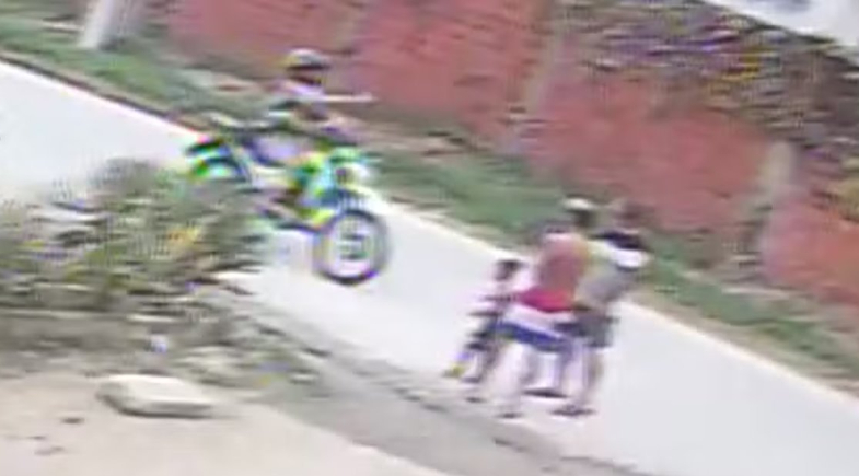 As imagens mostram o momento em que a vítima para na rua para conversar com um amigo. Nesse instante, um homem em uma motocicleta passa pelo local e efetua vários disparos de arma de fogo contra ele.
