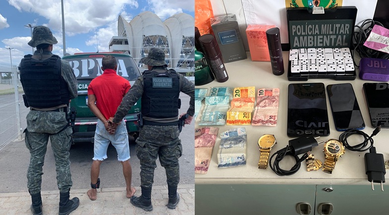 Uma equipe do Batalhão de Polícia do Meio Ambiente (BPMA) prendeu um homem suspeito de arrombar uma residência e furtar diversos objetos no bairro Romeiro Aureliano, em Juazeiro do Norte, no Ceará. A ação policial aconteceu após diligências realizadas para localizar o autor do crime. O suspeito foi abordado nas proximidades do Parque Ecológico das Timbaúbas, onde foi encontrado com todos os bens subtraídos.