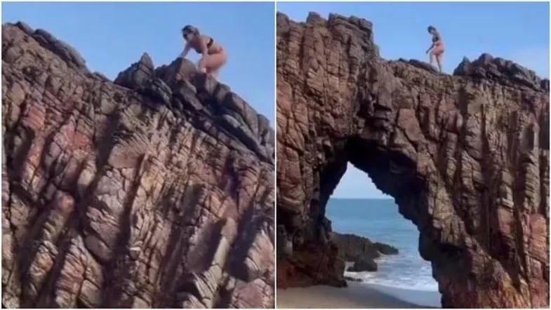 A influenciadora fitness que subiu no topo da Pedra Furada, monumento natural que é o principal símbolo da Vila de Jericoacoara, no litoral do Ceará, foi multada pelo Instituto Chico Mendes de Conservação da Biodiversidade (ICMBio). Ela subiu na pedra para fazer uma foto de biquíni, mas a prática é proibida.
