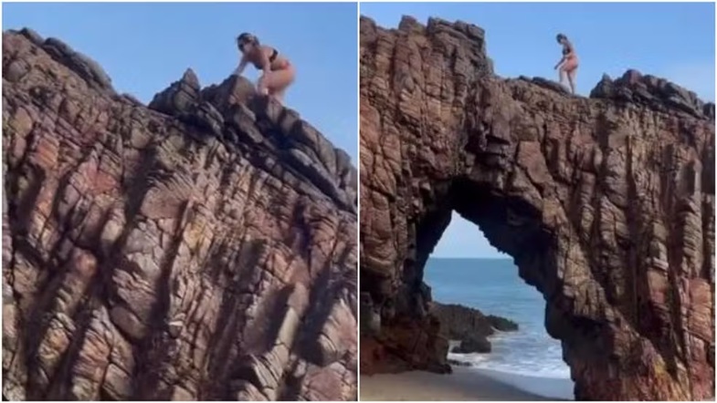 Uma influenciadora fitness subiu no topo da Pedra Furada, monumento natural que é o principal símbolo da Vila de Jericoacoara, no litoral do Ceará, para fazer uma foto de biquíni. A prática é proibida.