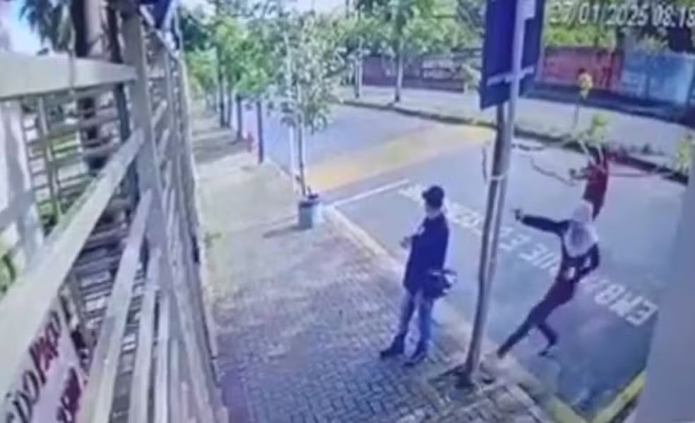 Uma câmera de segurança do prédio registrou o momento que a vítima estava em pé na calçada, segurando um capacete em uma mão e o celular na outra, quando três suspeitos chegaram encapuzados e de armas em punho.