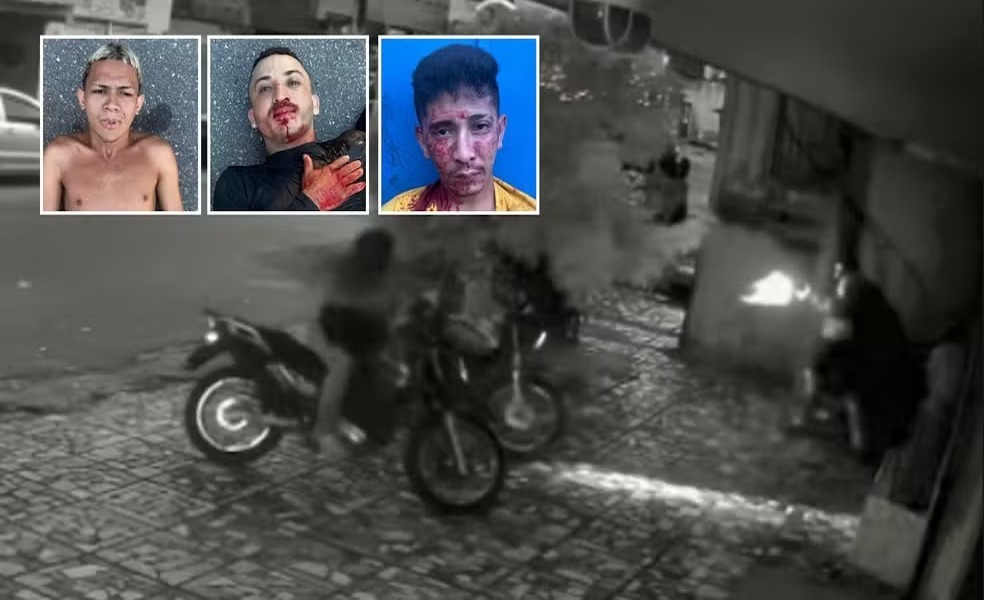 Um vídeo da câmera de segurança mostra o momento em que os três criminosos chegaram em uma motocicleta e abordaram o homem, que também está em uma moto.
