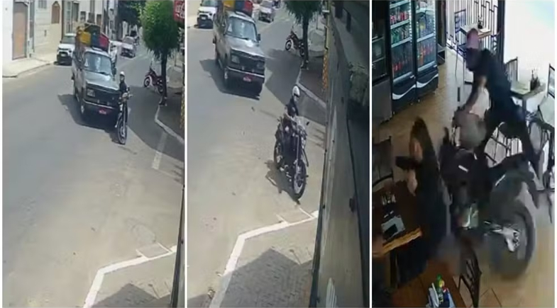 Após se chocarem, o motociclista acaba deslizando para dentro da padaria, onde dois clientes estavam sendo atendidos por uma funcionária. As câmeras internas do estabelecimento mostram captaram o momento exato em que a moto invade o espaço e para após se chocar contra os móveis.