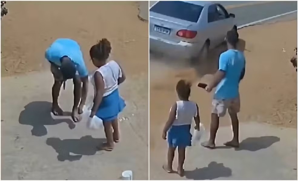 O pai parou para mostrá-la à filha e, em seguida, abaixou-se para pegá-la. Foi nesse exato momento que um carro em alta velocidade passou a poucos metros deles, parte sobre a calçada e parte na via.