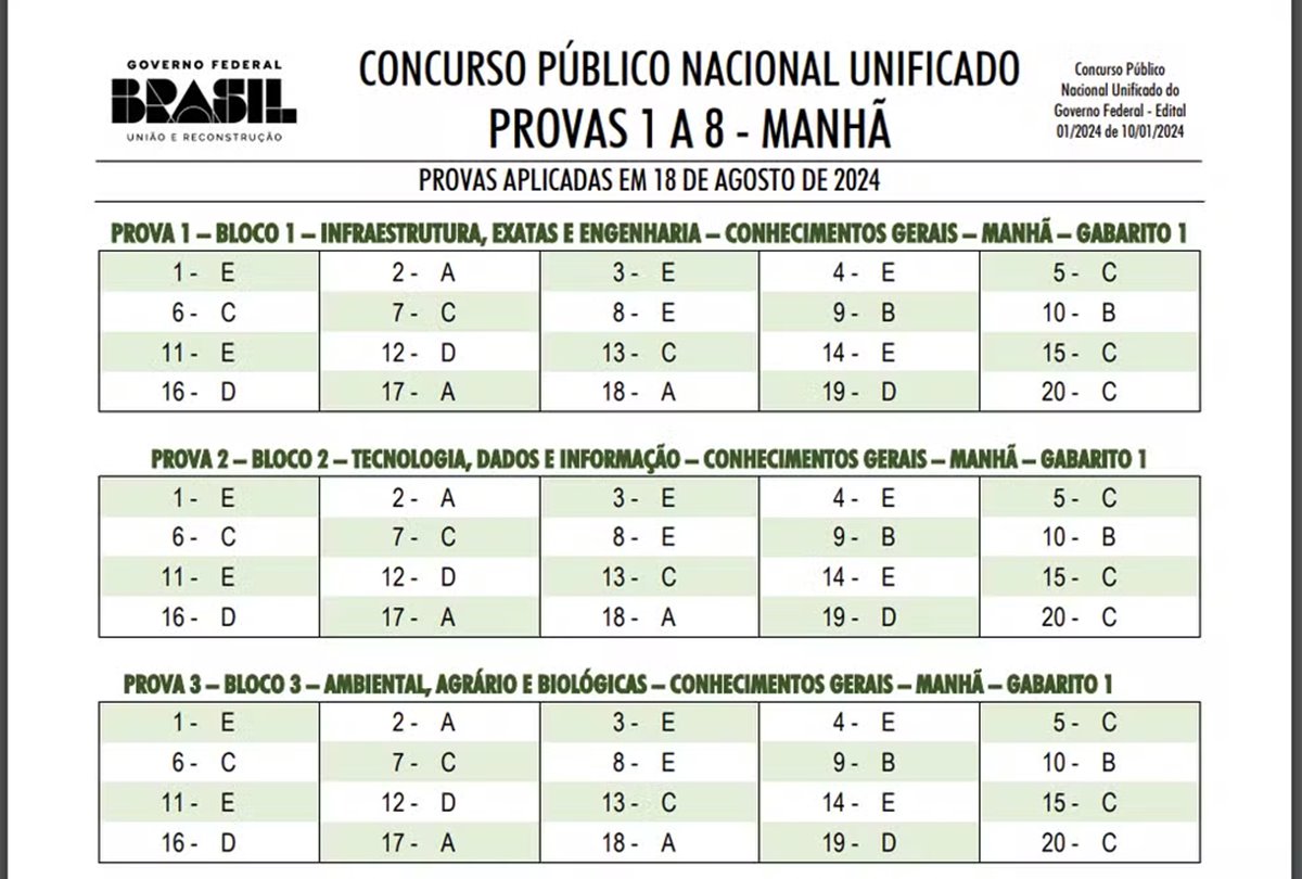 O governo federal anunciou nesta terça-feira (20) os gabaritos oficiais das provas objetivas do Concurso Nacional Unificado (CNU), conhecido como o "Enem dos concursos". As provas, realizadas no domingo (18), contaram com um total de 36 versões, como parte das medidas antifraude. Essas versões foram distribuídas entre os 8 blocos, que correspondem às áreas com vagas disponíveis.