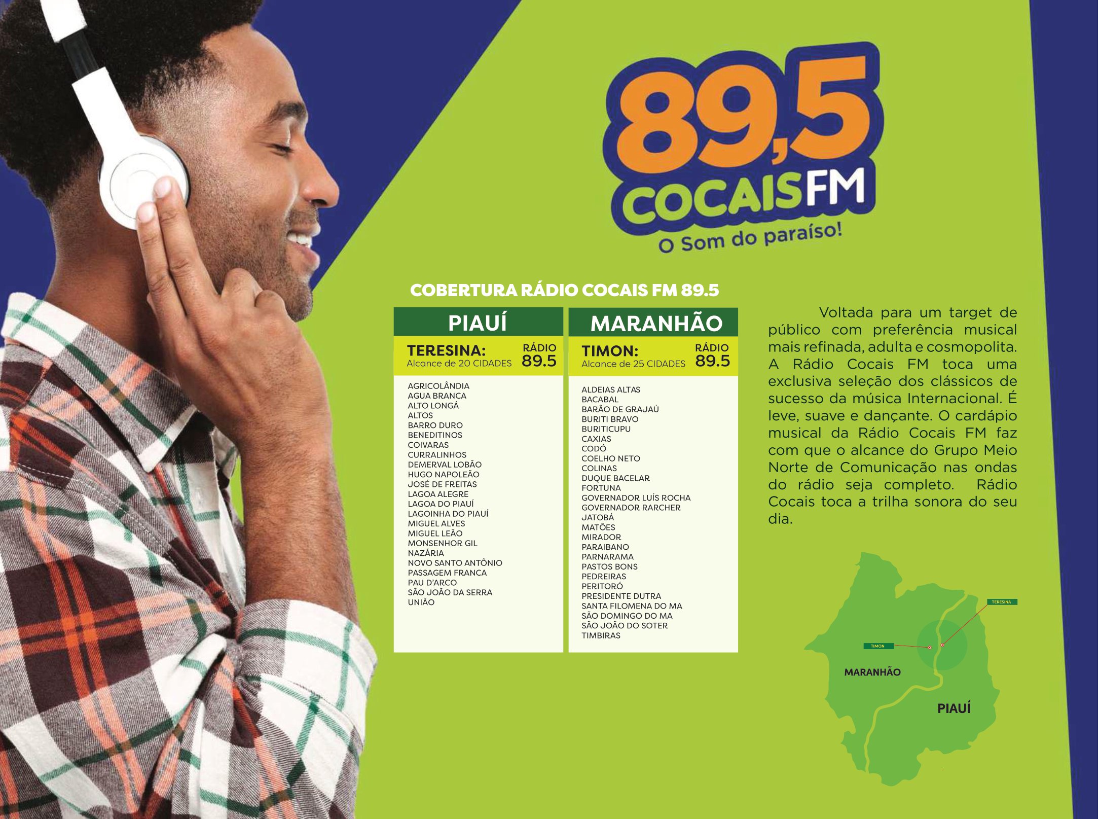 Voltada para um target de público com preferência musical mais refinada, adulta e cosmopolita. A Rádio Cocais FM toca uma exclusiva seleção dos clássicos de sucesso da música Internacional. É leve, suave e dançante. O cardápio musical da Rádio Cocais FM faz com que o alcance do Grupo Meio Norte de Comunicação nas ondas do rádio seja completo. Rádio Cocais toca a trilha sonora do seu dia.