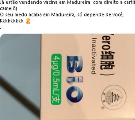 Portanto, se houver comercialização no país de produtos que se passam pela vacina contra Covid-19 com a embalagem da Sinopharm em camelôs, websites ou quaisquer outros meios, tratam-se de materiais falsos ou que entraram no Brasil ilegalmente.