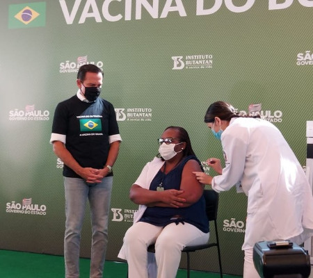 Após ser imunizada, ela recebeu do governador João Doria um selo simbólico com os dizeres “Estou vacinado pelo Butantan” e uma pulseira com a frase “Eu me vacinei”.