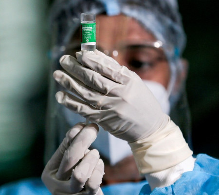 Profissional da saúde com uma vacina da AstraZeneca produzida pelo Instituto Serum, da Índia | Foto: Dinuka Liyanawatte/Reuters