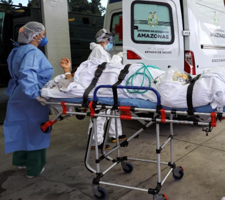 Médicos chegando ao Hospital Getulio Vargas, em Manaus, com paciente infectado pelo novo coronavírus - Imagem: BRUNO KELLY/REUTERS