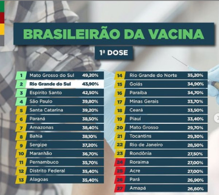Neste sentido, o Governo do Rio Grande do Sul divulgou ontem, 17 de junho, o ranking atualizado da vacinação nos Estados. Até o momento a liderança está com o Mato Grosso do Sul, que já imunizou com a 1ª dose 49,20% da sua população, se aproximano de 50%; enquanto isso, o Amapá aparece na última posição, com apenas 26,60%.