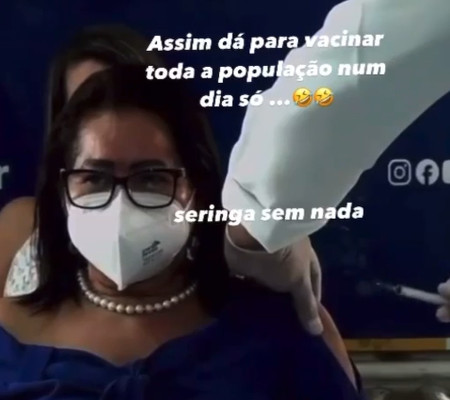 No vídeo original, a mesma mulher aparece sendo vacinada normalmente, com uma dose da Coronavac, vacina que chegou ao Ceará na segunda-feira (18).