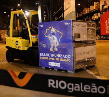 O primeiro lote com cerca de 90 litros do Ingrediente Farmacêutico Ativo (IFA) para a produção da vacina Oxford-AstraZeneca contra a covid-19 já está no Rio de Janeiro. O material chegou, ontem, às 18h17 ao terminal de cargas do Aeroporto Internacional Tom Jobim-RIOGaleão, na zona norte da cidade.