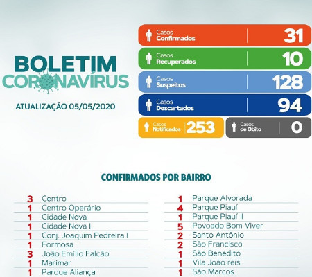 Atualizando os dados que mostram a real situação da COVID - 19 no município de Timon, o boletim epidemiológico emitido nesta terça-feira (5) apontam 31 casos confirmados, 128 casos suspeitos, 10 casos recuperados, 94 casos descartados, 253 casos notificados e 0 óbito.
