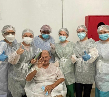 Na saída da UTI , o idoso posou para fotos e falou sobre gratidão. “Obrigado por tudo, aqui só tem anjo, fiquem com Deus”.