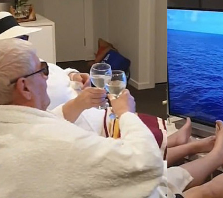 Para imitar o mar, o casal colocou um vídeo de ondas na televisão, vestiu roupões e bebeu taças de vinho. A aventura foi filmada pela filha Jane e postada nas redes sociais. Até o neto entrou na brincadeira e fez o som do vento para a