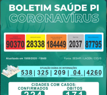 As 224 cidades piauienses foram atingidas pela pandemia. Os casos confirmados no estado somam 90 370 casos. Já os óbitos pelo novo coronavírus chegam a 2037 e foram registrados em 171 municípios. Até agora, morreram 1.172 homens e 865 mulheres.