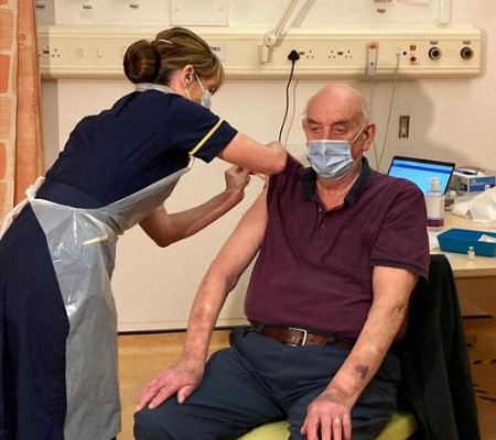 O Reino Unido se tornou nesta segunda-feira (4) o primeiro país do mundo a vacinar pessoas de grupo de risco com o imunizante desenvolvido pela Universidade de Oxford em parceira com a farmacêutica AstraZeneca. Brian Pinker, de 82 anos, recebeu a vacina no hospital Churchill, da própria universidade, perto de onde a vacina foi desenvolvida. Pinker faz diálise e afirmou que estava muito satisfeito e agora espera comemorar seu 48º aniversário de casamento com sua esposa Shirley este ano.