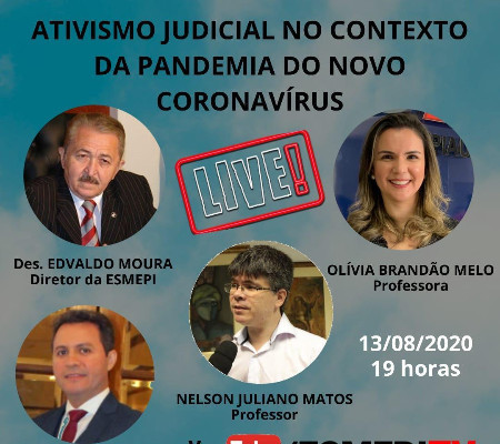 A Escola Superior da Magistratura do Piauí realizará, sob a coordenação do Desembargador Edvaldo Pereira de Moura, às 19 horas do dia 13 de agosto, mais uma live, com o tema: O ativismo judicial, no contexto da pandemia do novo Coronavírus.