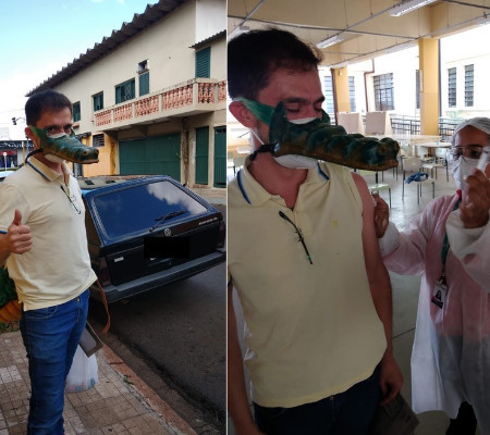 O morador tomou a dose da Oxford/AstraZeneca por volta das 13h30 no Colégio Industrial. Ele foi com a boca e o rabo da fantasia de jacaré emprestados de uma amiga que é artista.