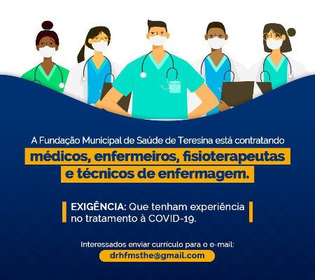 A Fundação Municipal de Saúde (FMS), anunciou nesta terça-feira (16) que a Prefeitura de Teresina está contratando profissionais de Saúde em caráter emergencial para o enfrentamento a covid-19.