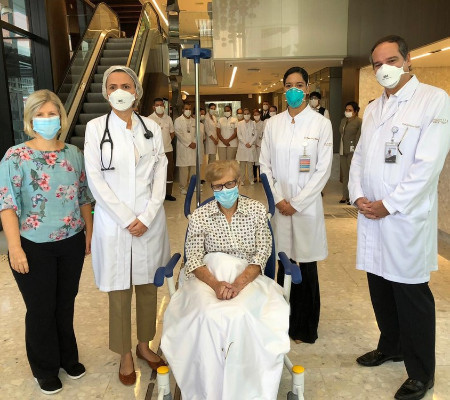 Com seis netos e cinco bisnetos, a nonagenária deixou o hospital sob aplausos dos profissionais.