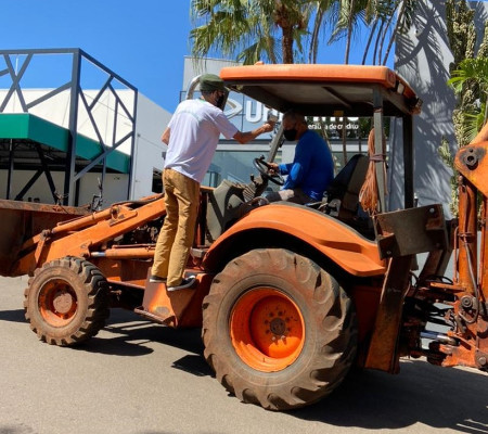 Idoso vai com retroescavadeira a drive-thru para tomar vacina | Foto: Divulgação