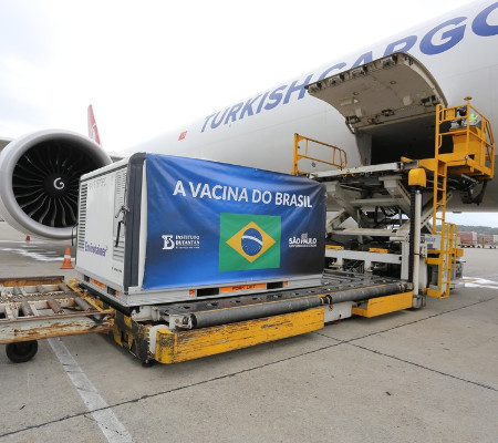 O primeiro lote com 120 mil doses chegou ao Brasil no dia 19 de novembro. O segundo carregamento, com 600 litros a granel do insumo, correspondente a um milhão de doses, desembarcou em 3 de dezembro. Já a terceira remessa, com 2 milhões de doses, foi recebida em 18 de dezembro.