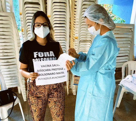 A jovem recebeu o imunizante por ser estagiária de educação física e estar cumprindo o estágio obrigatório na área. Maria foi receber a vacina vestida com uma camisa "Fora Bolsonaro" e com um cartaz escrito “Vacina salva, máscara protege e Bolsonaro mata”.