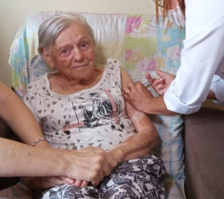Além de Olinda, a cuidadora dela, Maria José Fermino, de 61 anos, também foi vacinada nesta segunda-feira. Ela foi levada à Unidade Básica de Saúde (UBS) do município onde foi aplicada a primeira dose da vacina Oxford/AstraZeneca. A previsão é que ela receba a segunda dose em 8 de junho.