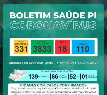 O número de mortes relacionadas à Covid-19, doença causada pelo novo coronavírus, aumentou para 18 no Estado do Piauí, segundo boletim divulgado pela Secretaria Estadual de Saúde (SESAPI), na noite deste sábado, 25 de abril. Um homem, de 21 anos, de Itaueiras, faleceu no Hospital Regional Tibério Nunes, em Floriano. Ele fazia tratamento para tuberculose. Os casos confirmados subiram para 331 no Estado.