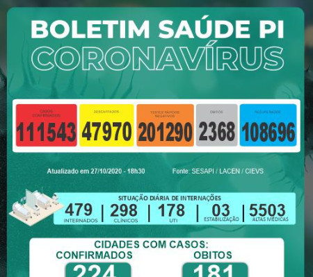 Dos leitos existentes na rede de saúde do Piauí para atendimento à Covid-19, há 479 ocupados, sendo 298 leitos clínicos, 178 UTIs e três leitos de estabilização. As altas acumuladas somam 5.503 até o dia 27 de outubro.