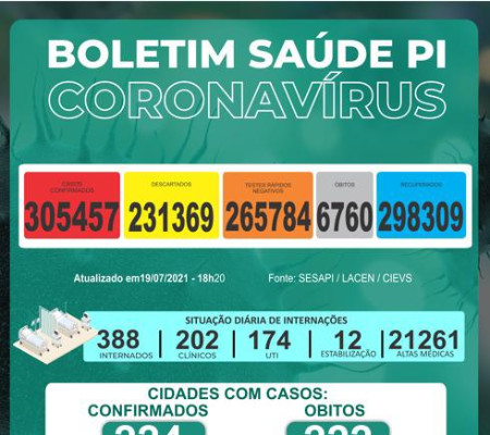 Os casos confirmados no estado somam 305.457 distribuídos em todos os municípios piauienses. Já os óbitos pelo novo coronavírus chegam a 6.760 e foram registrados em 222 municípios.