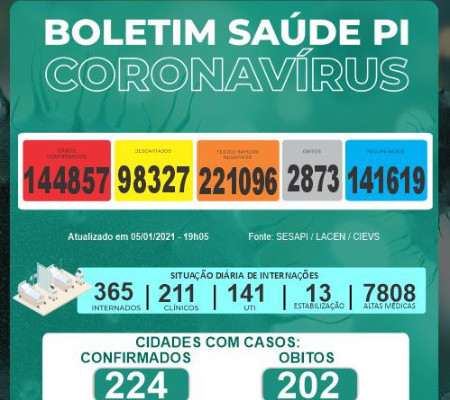 Os casos confirmados no estado somam 144.857 distribuídos em todos os municípios piauienses. Já os óbitos pelo novo coronavírus chegam a 2.873 e foram registrados em 202 municípios. Até agora, morreram 1.684 homens e 1.189 mulheres.