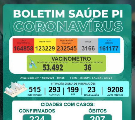 Dos leitos existentes na rede de saúde do Piauí para atendimento à Covid-19, há 515 ocupados, sendo 293 leitos clínicos, 199 UTIs e 23 em leitos de estabilização. As altas acumuladas somam 9.208 até o dia 11 de fevereiro de 2021.